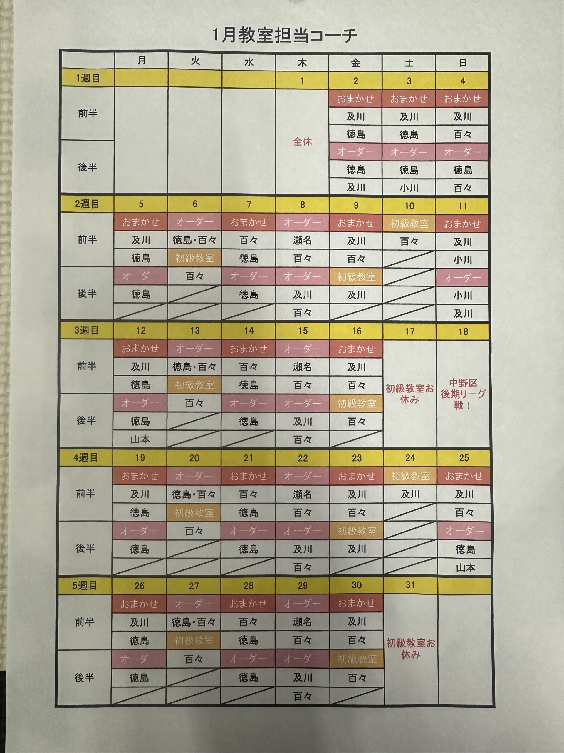 1月の教室担当コーチは以下の通りです。